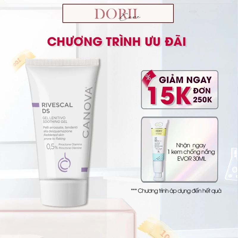 Canova Rivescal DS Soothing Gel 50ml tại Dorii Care là gel chăm sóc da chuyên biệt đến từ Ý, được thiết kế dành riêng cho làn da nhạy cảm, da kích ứng và đặc biệt là viêm da tiết bã. Sản phẩm giúp làm dịu nhanh tình trạng đỏ da – ngứa – bong tróc, đồng thời kiểm soát bã nhờn và ức chế nấm Malassezia, từ đó cải thiện rõ rệt tình trạng da khó chịu và phục hồi làn da khỏe mạnh.