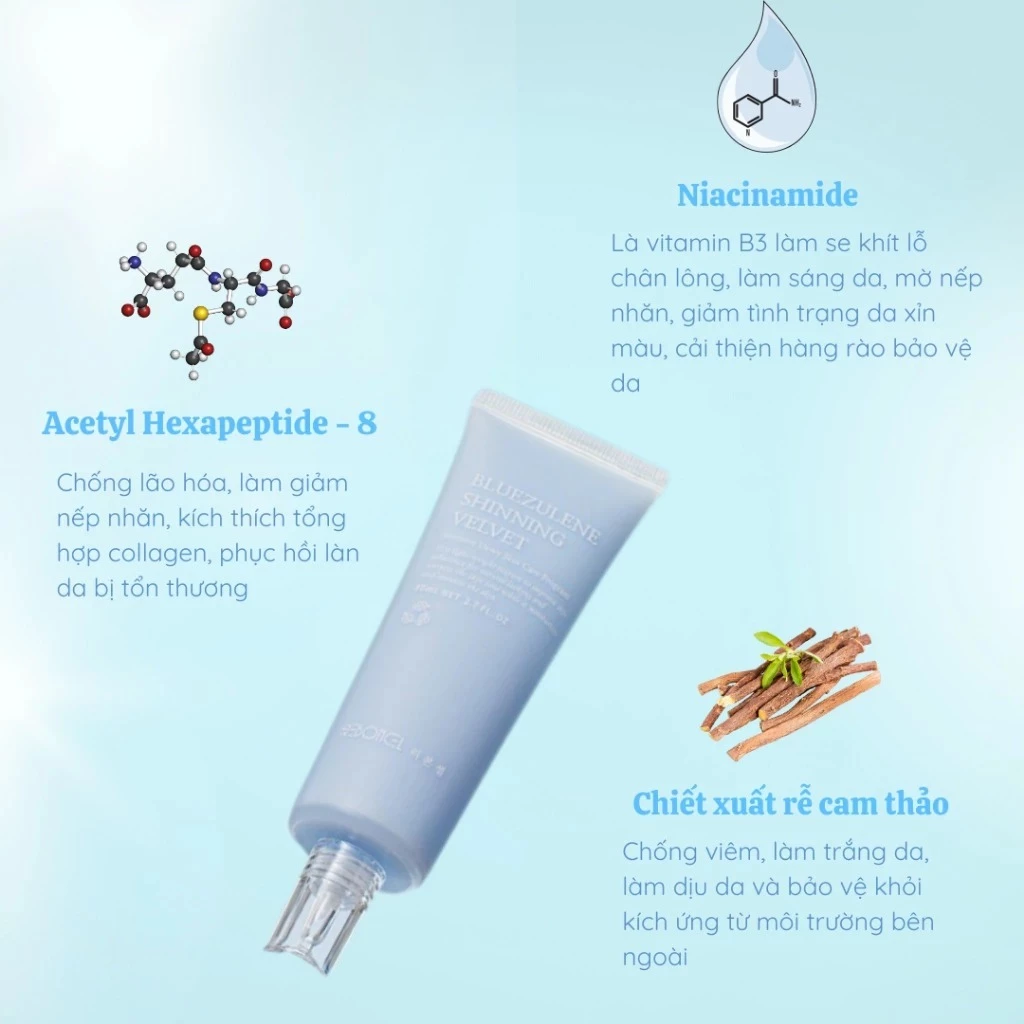 Kem cấp ẩm sáng da Reboncel Bluezulene Shinning Velvet 80ML là kem dưỡng đa năng 2 trong 1 vừa dưỡng ẩm sâu vừa thay thế mặt nạ ngủ tiện lợi. Sản phẩm chứa Niacinamide 2%, Peptide và chiết xuất thiên nhiên giúp làm sáng da, phục hồi tổn thương, giảm nếp nhăn và tăng độ đàn hồi, mang lại làn da mềm mịn, căng bóng và khỏe mạnh mỗi ngày.