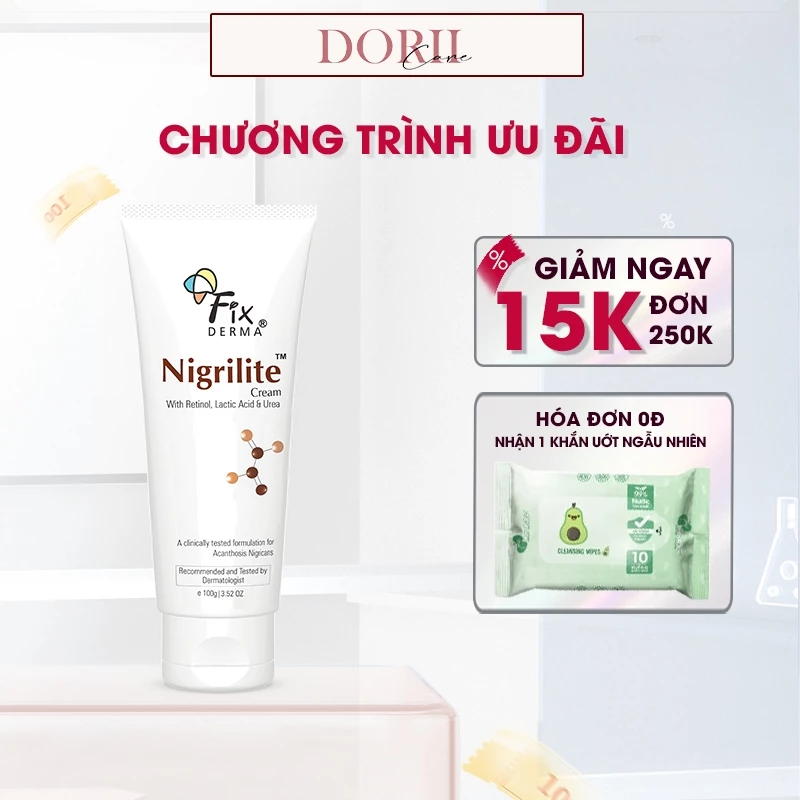 Kem Giảm Thâm Nách, Thâm Cơ Thể Fixderma Nigrilite Cream 100g tại Dorii Care là giải pháp chăm sóc da chuyên sâu giúp làm sáng các vùng da sẫm màu như nách, đầu gối, khuỷu tay, bẹn… Với công thức chứa Retinol, Urea và Lactic Acid, sản phẩm hỗ trợ tẩy tế bào chết nhẹ nhàng, cải thiện sắc tố và mang lại làn da đều màu, mịn màng hơn mỗi ngày.