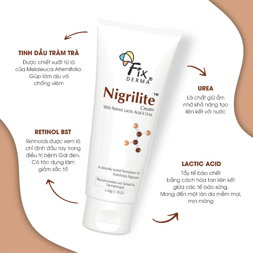 Kem giảm thâm Fixderma Nigrilite Cream 100g giúp làm sáng hiệu quả các vùng da sẫm màu như nách, đầu gối, khuỷu tay và bẹn. Với sự kết hợp của Retinol, Urea và Lactic Acid, sản phẩm hỗ trợ tẩy tế bào chết, dưỡng ẩm và cải thiện sắc tố da, mang lại làn da mềm mịn, đều màu và khỏe mạnh.